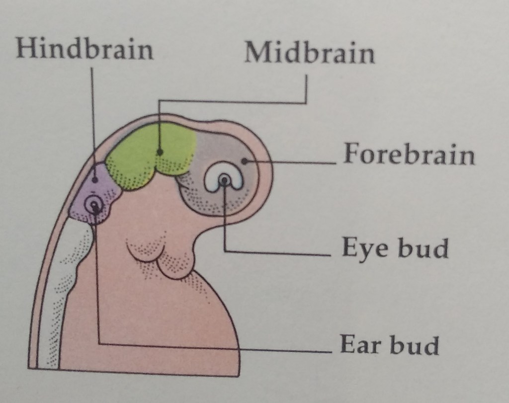 विकासशील तंत्रिका ट्यूब के हिस्से शुरू में एक सीधी रेखा बनाते हैं, लेकिन ट्यूब जल्द ही मुड़ जाती है ताकि अग्रमस्तिष्क और पश्चमस्तिष्क एक दूसरे के समकोण पर हों। इस स्तर पर पश्चमस्तिष्क तेजी से विकसित होता है और तंत्रिकाओं (कपालीय तंत्रिकाओं) की एक श्रृंखला विकसित करना शुरू कर देता है। अग्रमस्तिष्क भी बड़ा होने लगता है और उभार बनने लगता है। ये बड़े, मुड़े हुए सेरिब्रम और थैलेमस जैसी अंतर्निहित संरचनाएं बन जाएंगे।